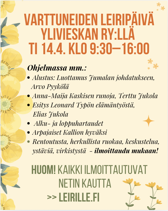 Tervetuloa Varttuneiden leiripäivään ti 14.4. Ylivieskan ry:lle!