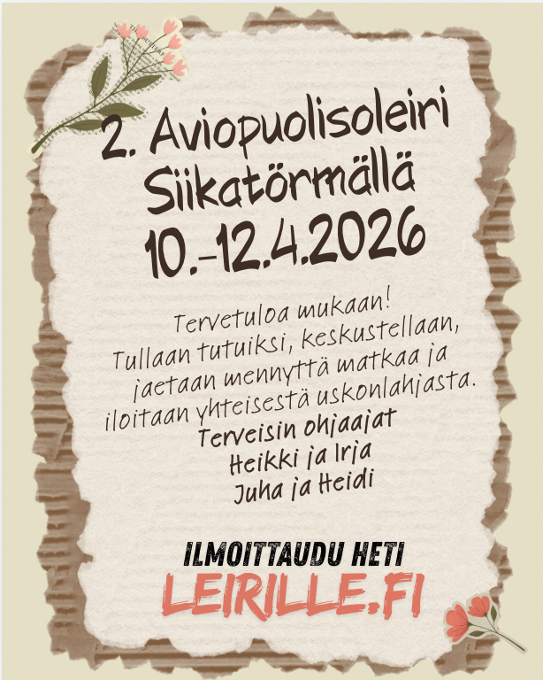 Tule viettämään virkistävä leiriviikonloppu yhdessä puolison kanssa. Leirillä voitte kokea uskossa virvoittumista. Uskomisen ilo ja toivon näköalat ovat leirillä vahvasti esillä. Rentoutumista saunoen, nukkuen, ulkoillen ja matkaystävien kanssa asioita jakaen. Leirin tavoitteena on keskinäisen rakkauden syventäminen ja uskon tiellä tukeminen.